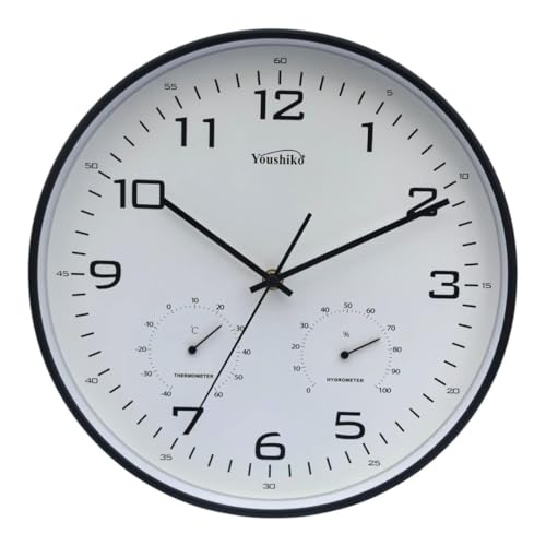 Youshiko Large Wall Clock with Temprature & Humidity, 12'' Non Ticking Silent Sweeping Seconds, Home/Kitchen/Office/School Clock, Easy to Read (Black) |