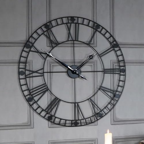 Klass Home 60cm Black Metal Large Wall Clock INDOOR / OUTDOOR | Silent Non-Ticking Roman Numerals Clocks For Living Room | Bedroom, Kitchen, Garden Clock | Home Decor |